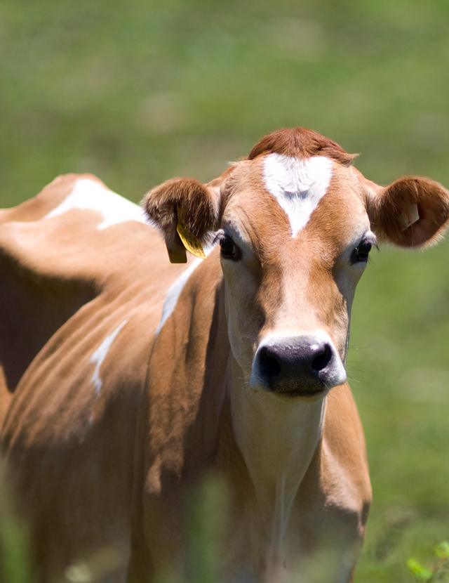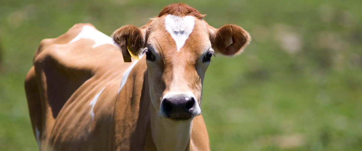 ジャージー牛はイギリスのジャージー島原産で、日本で飼育されている乳牛全体の0.7%程しかいない希少種です。ジャージー島は、スポーツ等の際に着用するジャージの語源でもあります。この柵で放牧しているジャージー牛は生後12か月~24か月のメス牛で、人間で言うともうすぐ大人の仲間入りするくらいの年齢です。