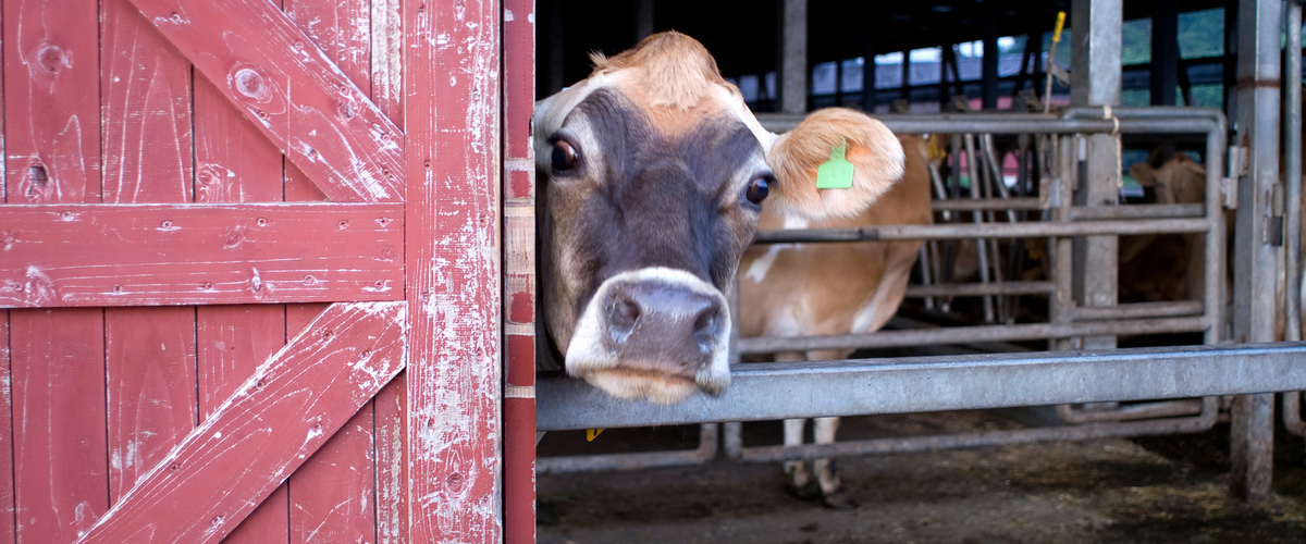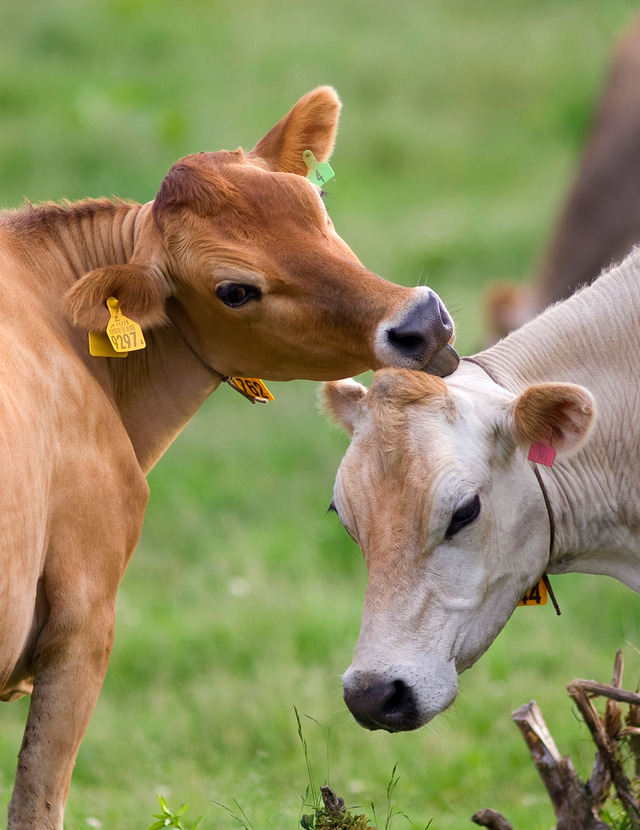 白黒の牛はホルスタインという種です。ジャージー牛はホルスタインに比べ体重は65%程度と小柄、温厚で人懐こい性格です。ジャージー牛から搾られる牛乳は、ホルスタインに比べ乳量は少ないですが、濃厚で栄養価の高いのが特徴です。