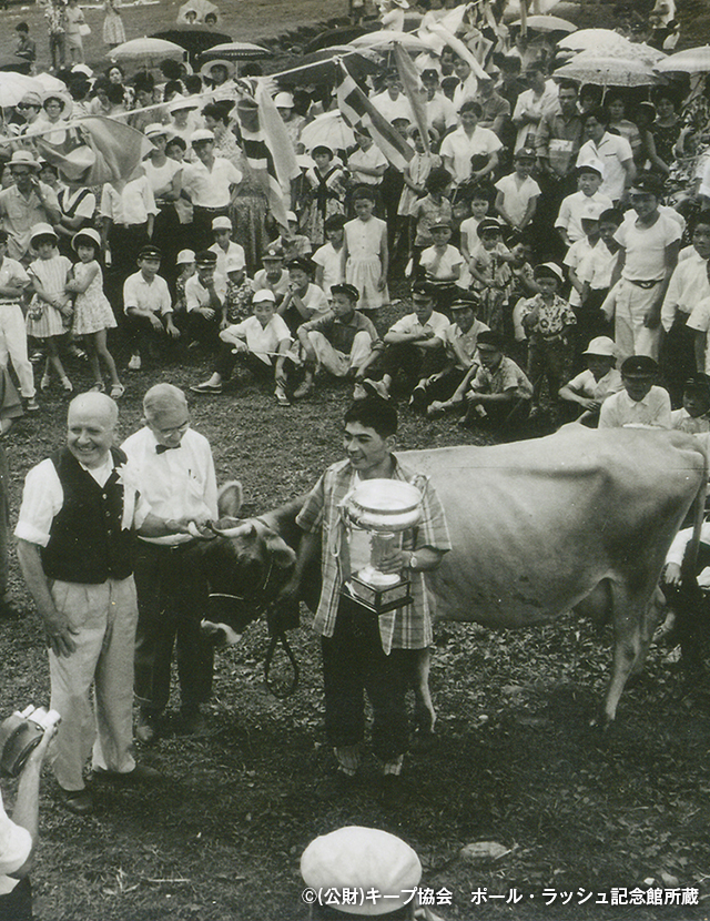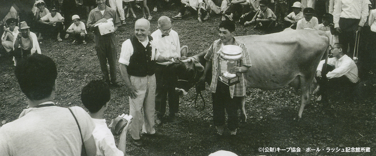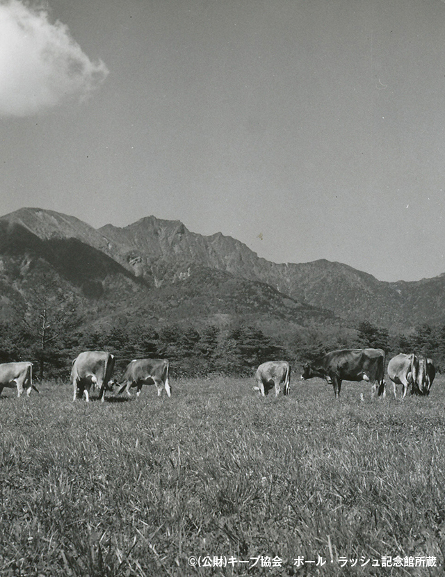 清泉寮にジャージー牛が初めて来たのは1951年頃。清里開拓の父と呼ばれる清泉寮の創設者ポール・ラッシュ博士がアメリカの篤志家より1頭の雄牛を寄付され、放牧を始めたのがきっかけです。