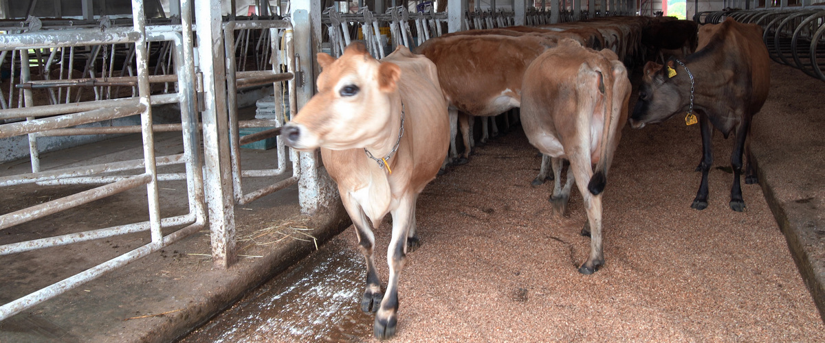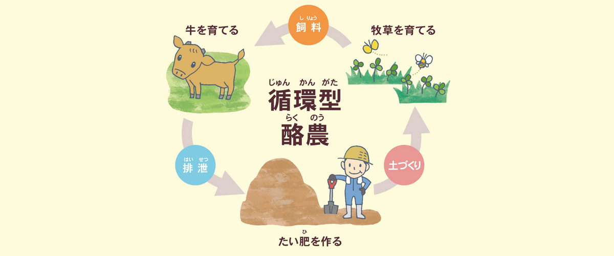 清泉寮ジャージー牧場には、東京ドーム15個分におよぶ広大な牧草地が広がっています。そこでは農薬を使わず、牛たちの糞でつくった堆肥を使い牧草を育て、その牧草を牛たちが毎日食べています。これを繰り返すことを「循環型酪農」と言い、のびのびとストレスなく暮らす牛たちからは、美味しくて安心な「人と地球の健康を考えた牛乳」が毎日搾られています。